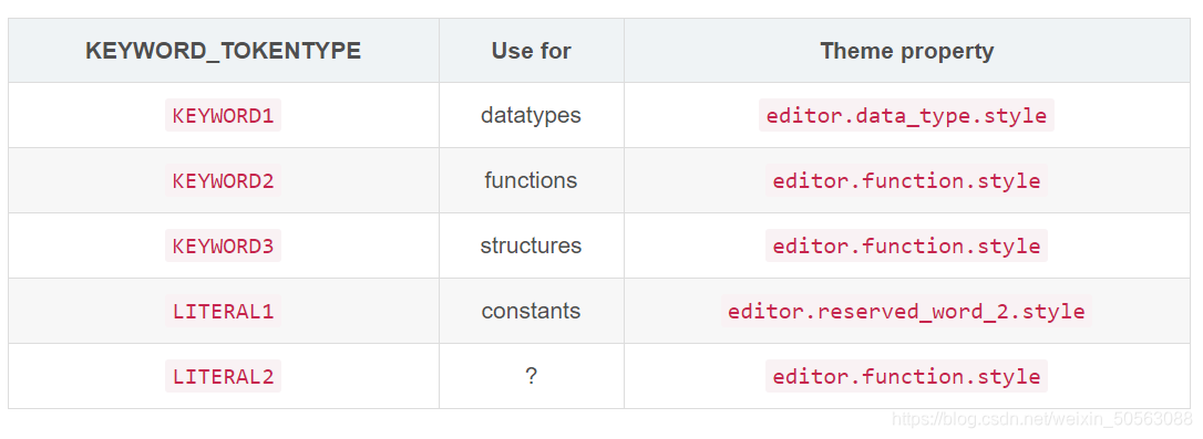 Trong tính năng tô sáng từ khóa của Arduino IDE, KEYWORD1 được nhận dạng là tô sáng kiểu dữ liệu, KEYWORD2 là tô sáng hàm, KEYWORD3 là tô sáng cấu trúc và LITERAL1 là hằng số.