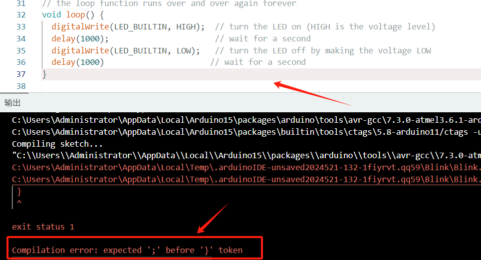 Điều này sẽ báo lỗi, không có dấu chấm phẩy trước "}" và trình biên dịch cũng đánh dấu số dòng tương ứng.