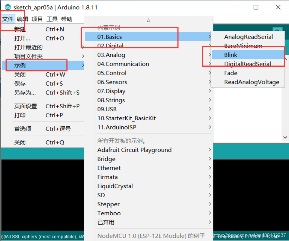 Chúng ta mở ví dụ kiểm tra Blink và xem trình biên dịch nhắc nhở chúng ta điều gì khi không cắm bo mạch chủ.