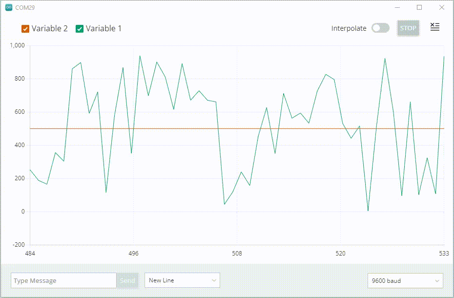 Màn hình Serial Plotteri hiển thị sự biến động của biến 1 và 2.
