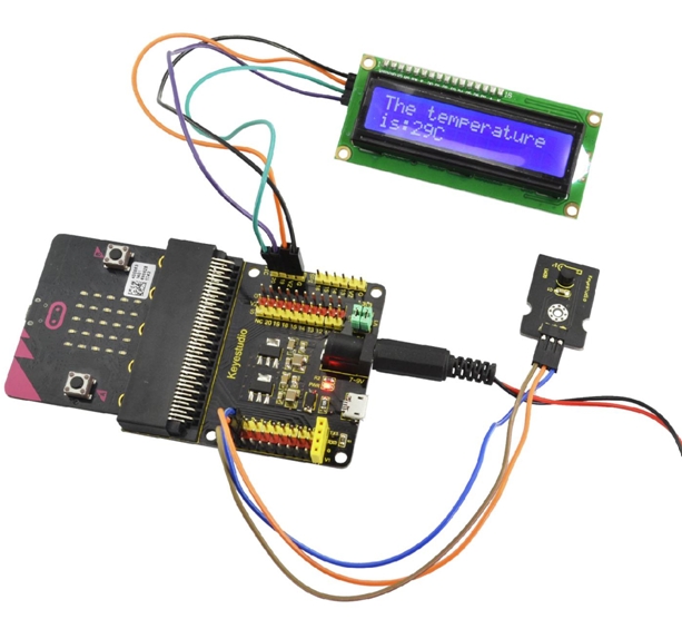 + Kết nối cảm biến LM35 và LCD I2C 1602 với micro:bit sensor shield bằng dây nối;