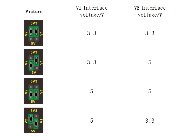 Điện áp đầu ra: chọn 3,3V hoặc 5V qua nắp nhảy V1/V2