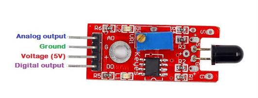 Cảm biến ngọn lửa có thể phát hiện ngọn lửa trong phạm vi bước sóng 760 – 1100 nano mét. Những ngọn lửa nhỏ như ngọn lửa nhẹ hơn có thể được phát hiện ở khoảng cách khoảng 0,8m. Góc phát hiện khoảng 60 độ và cảm biến đặc biệt nhạy cảm với quang phổ ngọn lửa. Mô-đun này bao gồm cảm biến hồng ngoại, chiết áp, mạch OP-Amp và đèn chỉ báo LED. Bộ khuếch đại thuật toán LM393 trên bo mạch được sử dụng làm bộ so sánh để điều chỉnh mức độ nhạy. Cảm biến có đầu ra kỹ thuật số và analog và độ nhạy có thể được điều chỉnh thông qua chiết áp màu xanh.