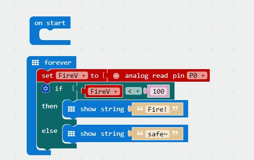 Nếu cảm biến ngọn lửa phát hiện ngọn lửa ở gần, ma trận led sẽ hiển thị “Cháy!”, Nếu không nó sẽ hiển thị “an toàn~”.