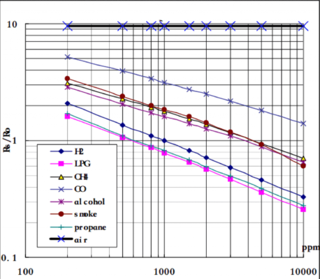 Mô-đun này có cảm biến điện hóa, giúp thay đổi điện trở đối với các nồng độ khác nhau của các loại khí khác nhau. Cảm biến được mắc nối tiếp với một biến trở để tạo thành mạch chia điện áp, biến trở dùng để thay đổi độ nhạy. Khi một trong các phần tử khí nêu trên tiếp xúc với cảm biến sau khi gia nhiệt, điện trở của cảm biến sẽ thay đổi. Sự thay đổi điện trở sẽ làm thay đổi điện áp trên cảm biến và vi điều khiển có thể đọc được điện áp này. Giá trị điện áp có thể được sử dụng để tìm điện trở của cảm biến bằng cách biết điện áp tham chiếu và điện trở của điện trở khác. Cảm biến có độ nhạy khác nhau đối với các loại khí khác nhau. Đường cong đặc tính độ nhạy được trình bày dưới đây đối với các loại khí khác nhau.