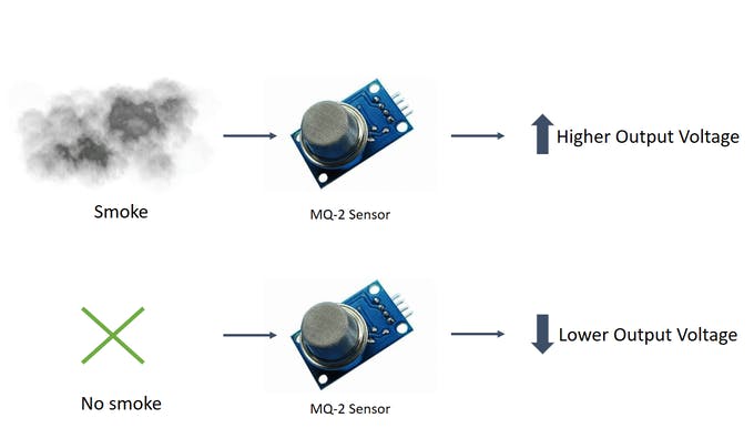 Cảm biến khói báo cáo khói theo mức điện áp mà nó tạo ra. Càng có nhiều khói thì điện áp nó tạo ra càng lớn. Ngược lại, càng tiếp xúc ít khói thì điện áp tạo ra càng ít.