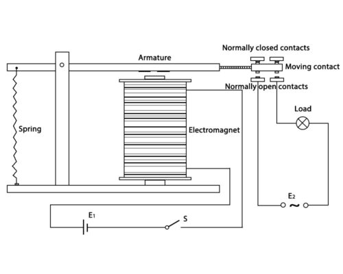 Sơ đồ hiển thị sơ đồ phần bên trong của rơle. Một lõi sắt được bao quanh bởi một cuộn dây điều khiển. Như hình vẽ, nguồn điện được cấp cho nam châm điện thông qua công tắc điều khiển và qua các tiếp điểm tới tải. Khi dòng điện bắt đầu chạy qua cuộn dây điều khiển, nam châm điện bắt đầu cung cấp năng lượng và do đó tăng cường từ trường. Do đó, cánh tay tiếp điểm phía trên bắt đầu bị hút vào cánh tay cố định phía dưới và do đó đóng các tiếp điểm gây ra đoản mạch nguồn điện cho tải. Mặt khác, nếu rơle đã mất điện khi các tiếp điểm đóng, thì tiếp điểm sẽ chuyển động ngược chiều và tạo ra mạch hở.