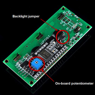 Chiết áp màu xanh trên I2C LCD1602 (xem hình bên dưới) dùng để điều chỉnh đèn nền để hiển thị tốt hơn. Và có một jumper trên bảng, nếu bạn tháo jumper này đi thì đèn nền sẽ luôn tắt.