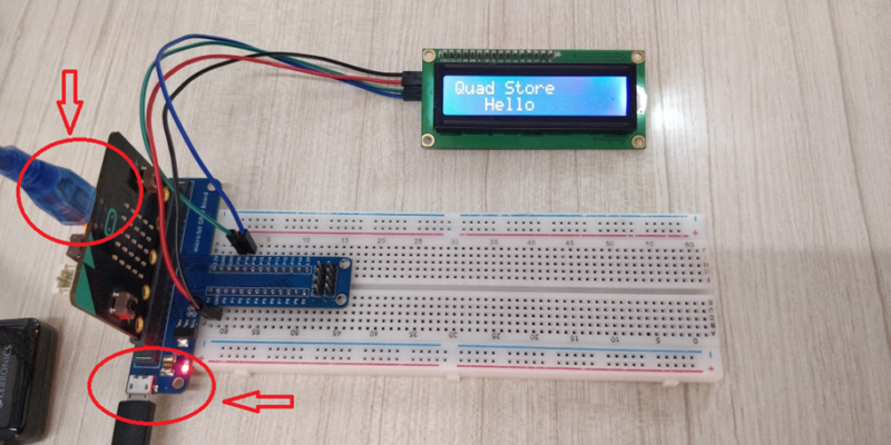 Sau khi tải mã này về micro bit của bạn, hãy rút dây USB ra và cắm dây USB vào bo mạch mở rộng, bạn sẽ thấy “Quad Store”,””Xin chào” trên màn hình LCD.