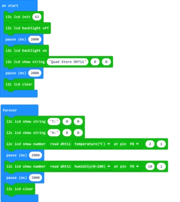 Sau khi tải mã này về micro bit của bạn, hãy rút dây USB ra và cắm dây USB vào bo mạch mở rộng, bạn sẽ thấy “QUAD STORE DHT 11” trên màn hình LCD, sau đó bạn sẽ thấy dữ liệu nhiệt độ và độ ẩm theo thời gian thực hiển thị trên LCD.