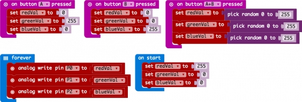 Bạn sẽ thấy đèn LED của bạn bật màu đỏ. Nếu bạn nhấn nút A trên micro:bit, màu sẽ chuyển sang màu xanh lục; nếu bạn nhấn nút B, màu sẽ chuyển sang màu xanh lam; và cuối cùng, nếu bạn nhấn nút A và B, RGB sẽ chuyển sang màu ngẫu nhiên.