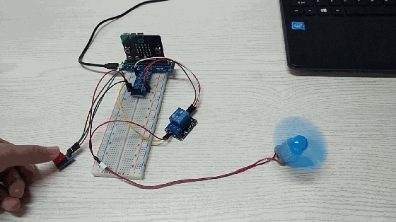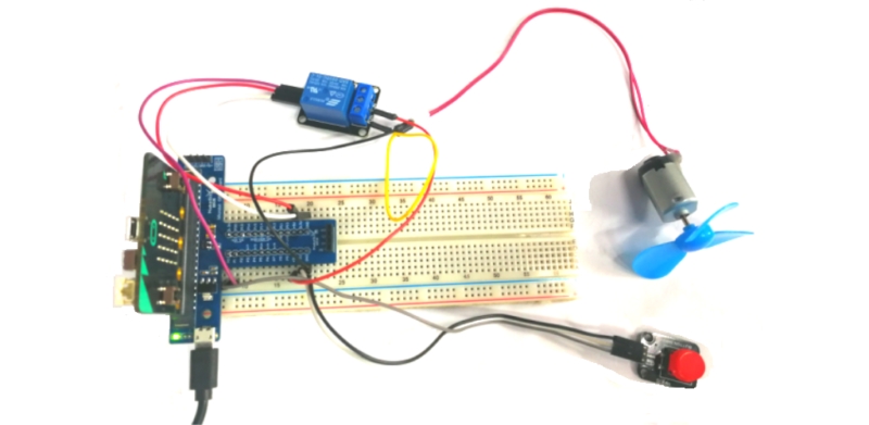 Khi trời nóng nực, có một chiếc quạt nhỏ bên cạnh sẽ rất thú vị. Bài này sẽ hướng dẫn các bạn cách sử dụng micro:bit để chế tạo một chiếc quạt mini, và chúng ta có thể sử dụng một nút bấm để điều khiển rơle để bật hoặc tắt quạt. Kết nối nút công tắc với giao diện P0, kết nối rơle với giao diện P1 và kết nối quạt với phía bên kia của rơle.
