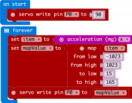 Khối này map trông có vẻ đáng sợ nhưng nó là một trong những khối hữu ích nhất trong MakeCode. Khối này map lấy một biến nhất định có phạm vi đã biết — trong trường hợp này là -1023 đến 1023 — và “ánh xạ” hoặc chia tỷ lệ phạm vi giá trị đó sang một phạm vi nhất định khác. Phạm vi nhất định mà chúng tôi muốn là 15 đến 165, đây là phạm vi quay an toàn tốt cho servo. Vì vậy, cuối cùng -1023 kết thúc bằng 0 và 1023 kết thúc bằng 165 tính từ map khối.